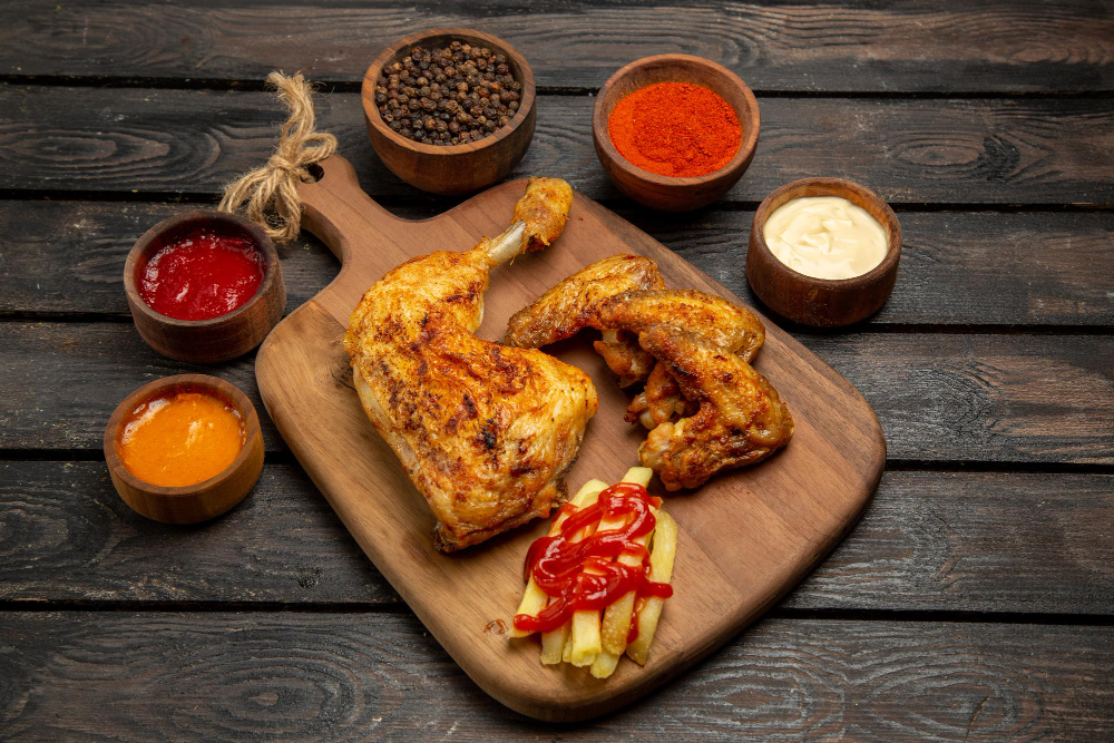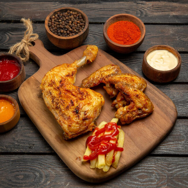 Chicken on the bone marinated overnight and roasted in the tandoor.
