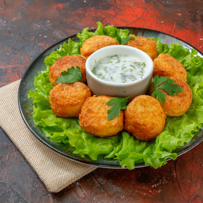 Mashed potato dumplings served in a creamy cashew-based sauce.